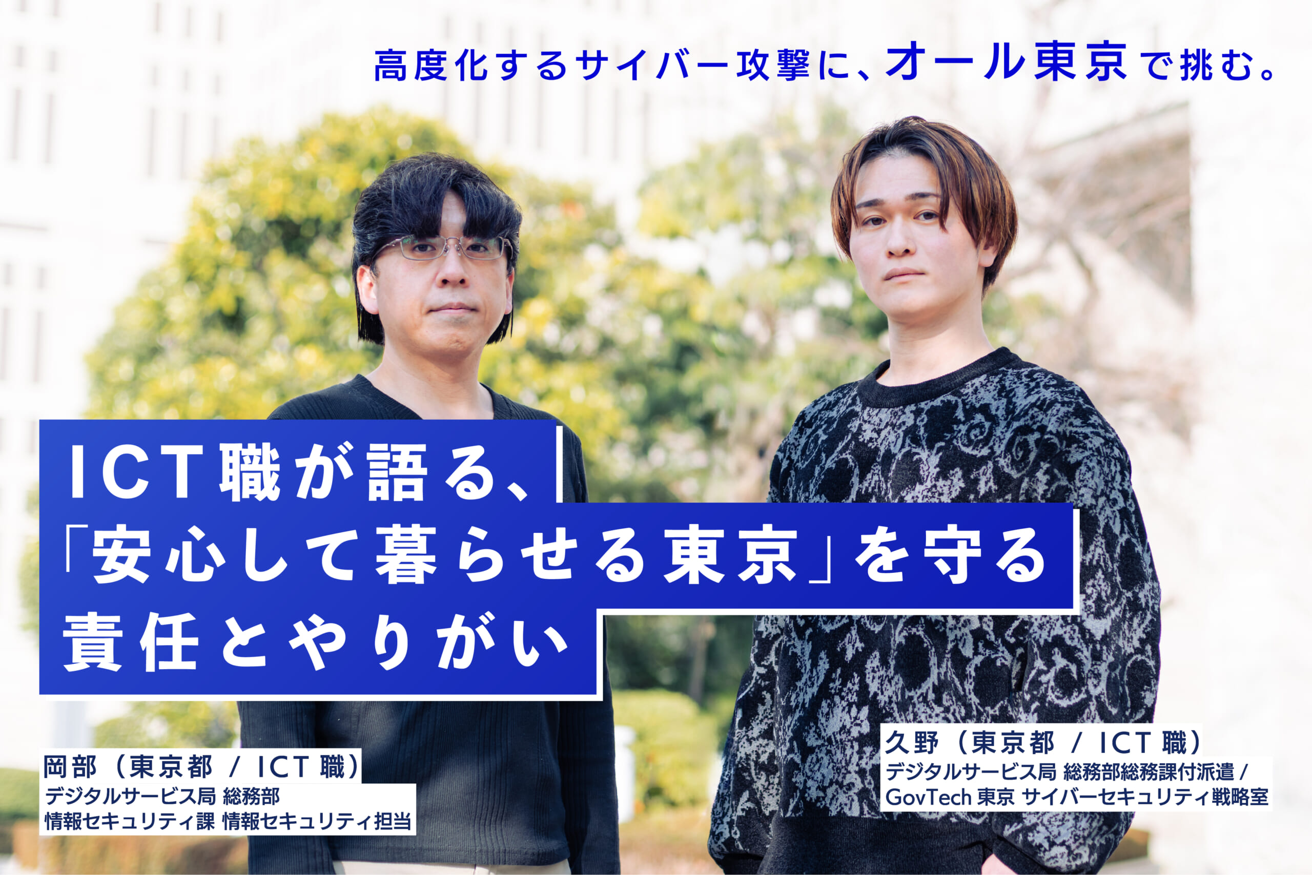 岡部:ICT職の魅力は、デジタルの力で政策を構想する段階から、システムの構築、運用までを一気通貫で担える点にあります。特にセキュリティ分野は学び続ける姿勢が欠かせませんが、その分、新しい技術に触れながら自分自身も成長できる領域です。東京をもっと良くしたい、技術やアイデアで社会に貢献したい。そんな思いを持つ方と、ぜひ一緒に働きたいですね。