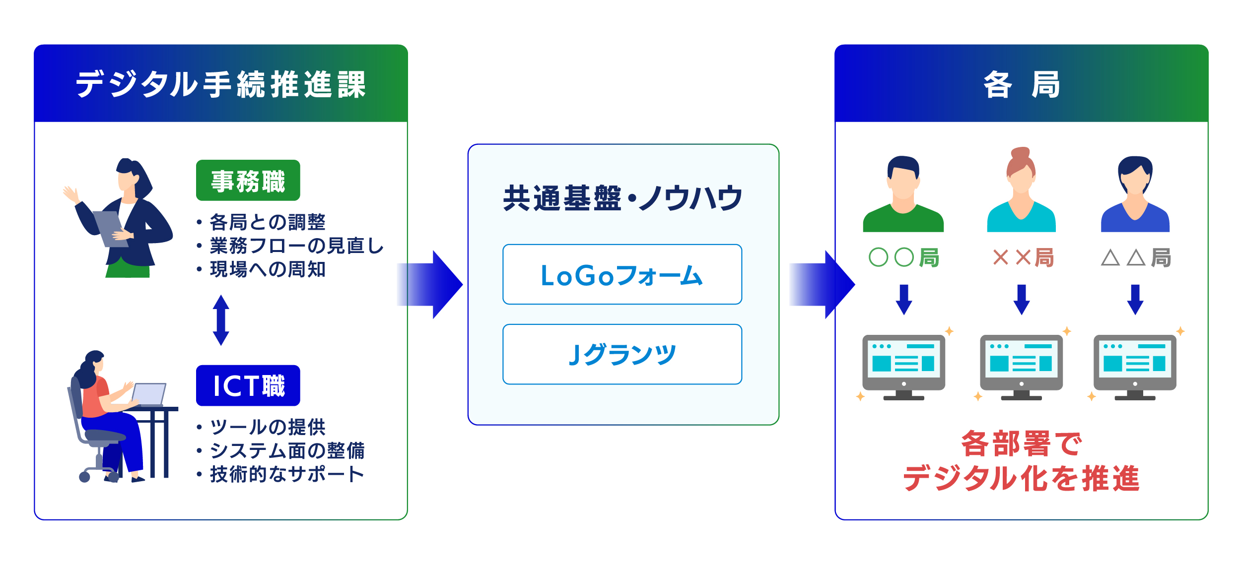 事務職が「旗」を振り、ICT職が「基盤」を整える