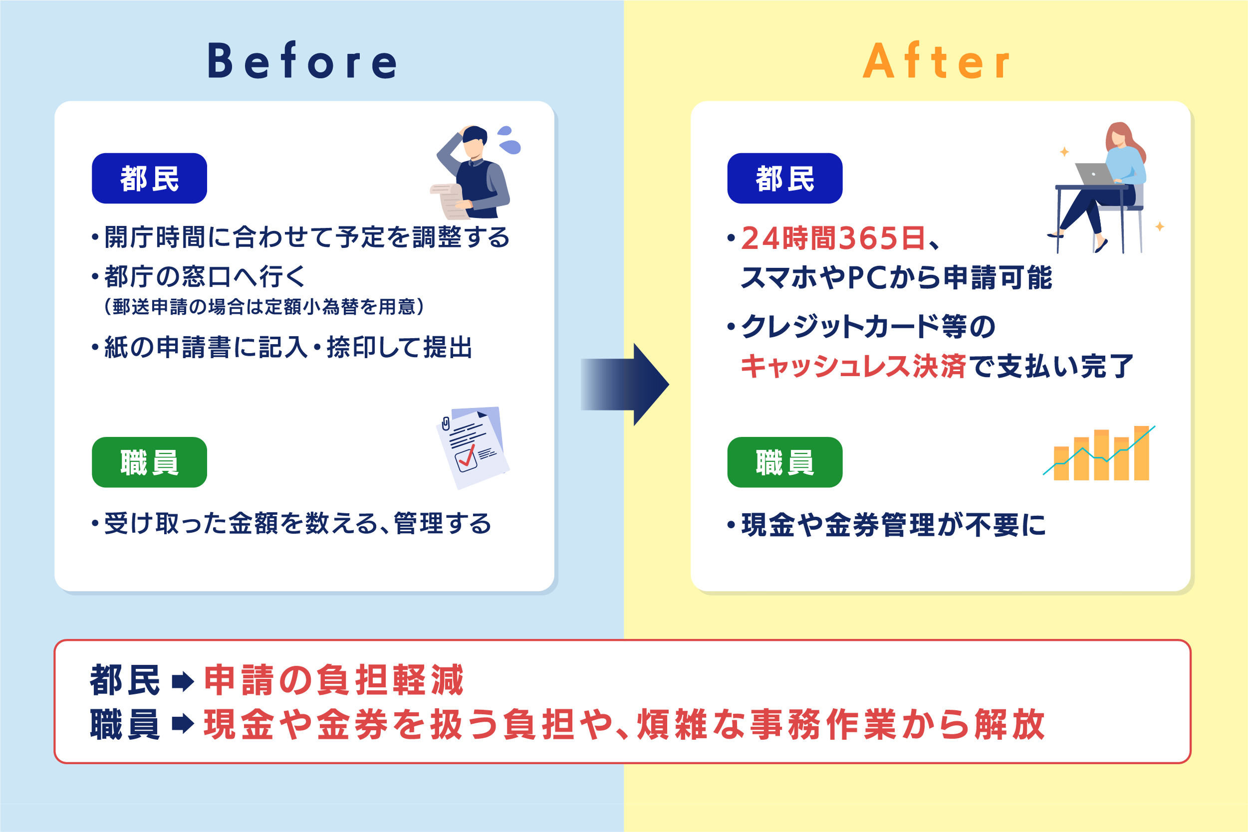 これにより、都民の方は「わざわざ窓口や郵便局に行く時間」や「小為替の手数料」が浮きます。一方、職員側も「窓口での現金の授受」や「送られてきた小為替を数え、管理する」という事務負担から解放されました。デジタル化は、都民の時間を生み出すだけでなく、職員を単純作業から解放し、より付加価値の高い業務に集中させる効果もあります。