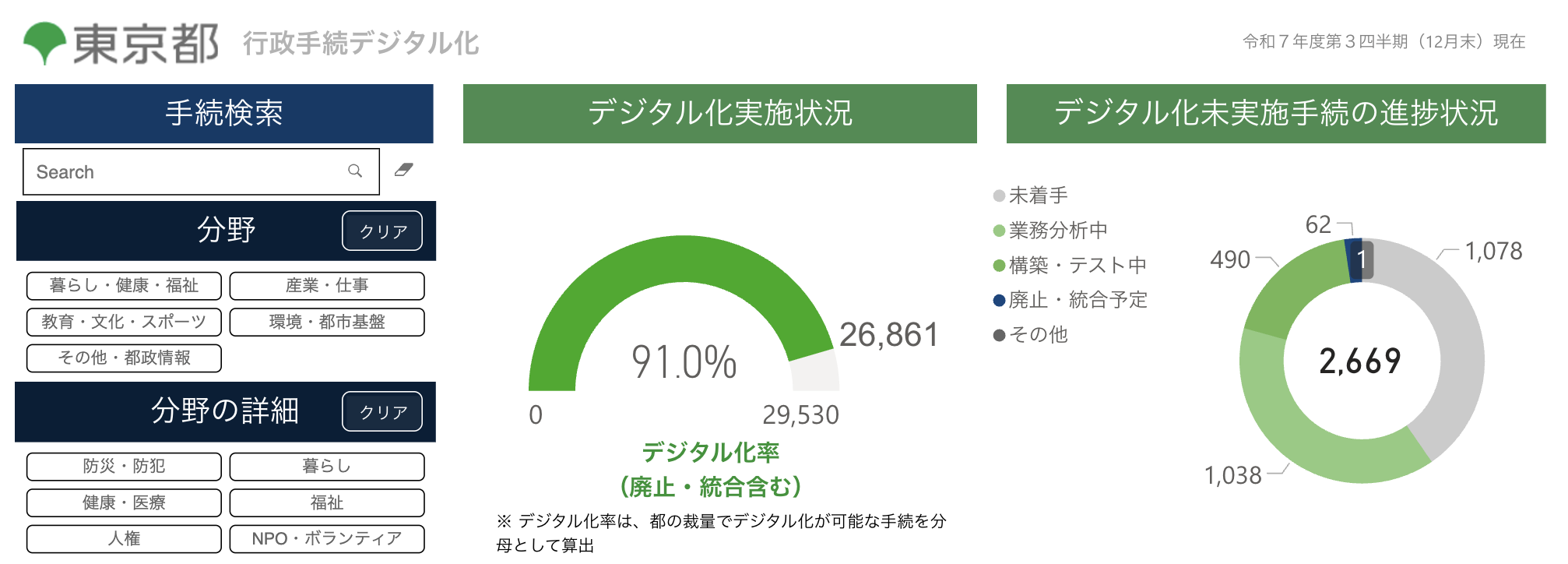 東京都では、全庁を挙げて「行政手続のデジタル化」に積極的に取り組んでいます。対象となる手続は、全庁で約3万件。そのうち91%(令和7年12月末現在)のデジタル化が完了し、都民の多様な生活スタイルに寄り添った行政サービスへと変貌を遂げつつあります。